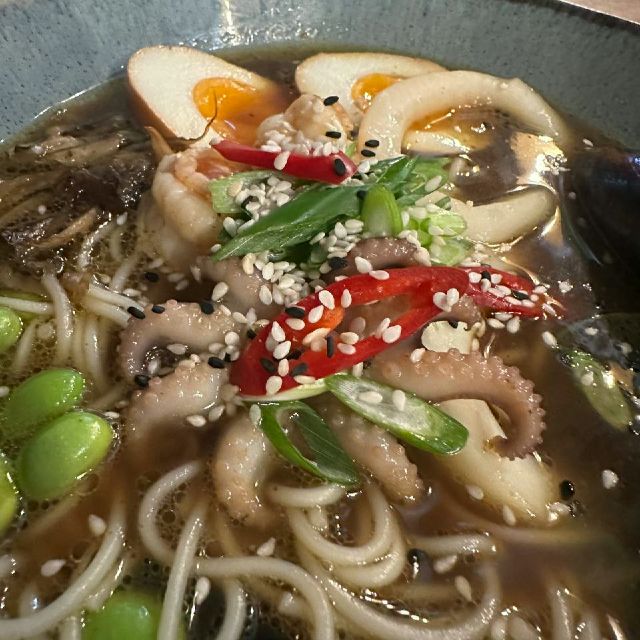 Солянка збірна, м'ясна: ковбаски мисливські, бекон копчений, свинина, курятина, оливки, огірок маринований, лимон, сметана, зелень.